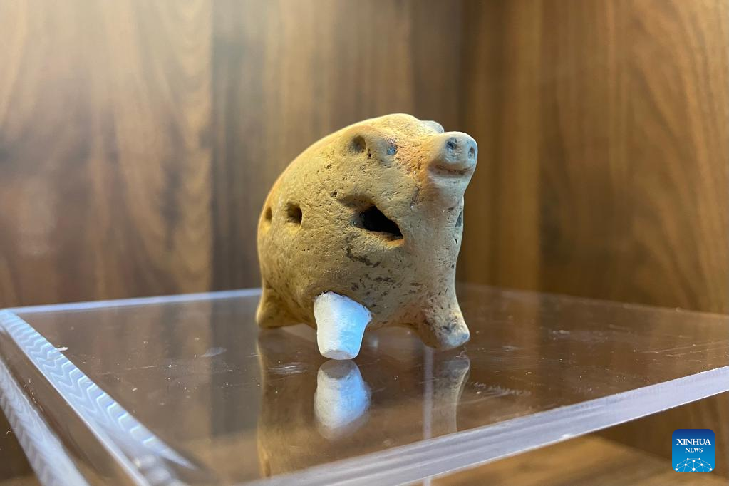 This photo taken on June 2, 2023 shows pig-shaped pottery discovered in the Maan Site of Wuxi City, east China's Jiangsu Province. Experts from different disciplines took part in an archaeological excavation of two tombs dating back to over 6,000 years ago in Wuxi City of east China's Jiangsu Province, and the entire process was livestreamed online on Friday. (Xinhua/Zhu Guoliang)
