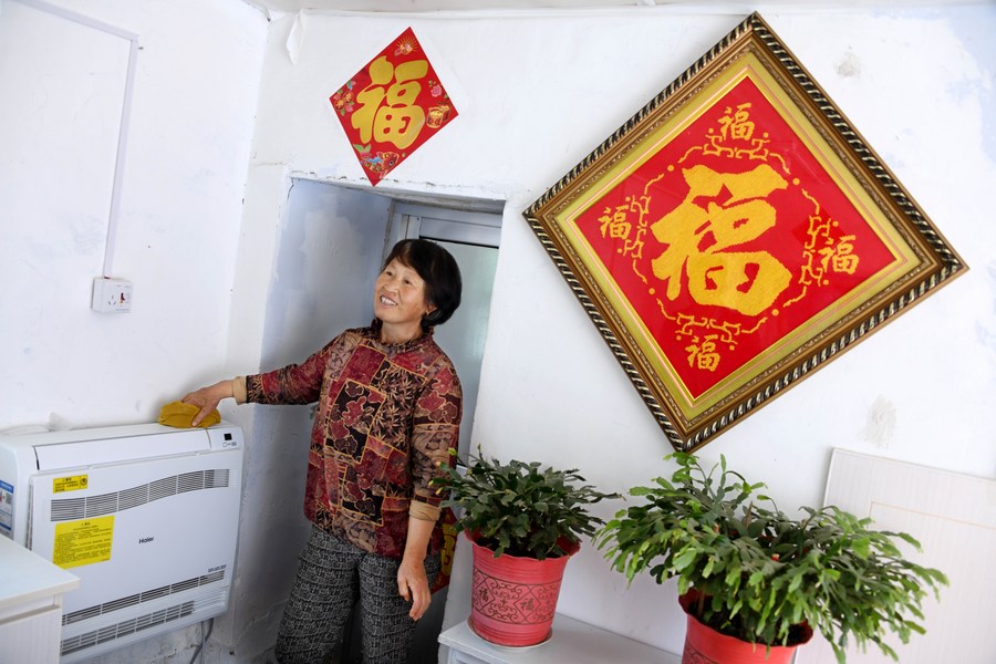 A resident shows an electric heater subsidized by the local government thanks to an initiative to switch from coal to electricity for winter heating on the Lingshan Island in Qingdao, east China's Shandong Province, June 5, 2023. (Xinhua/Li Ziheng)