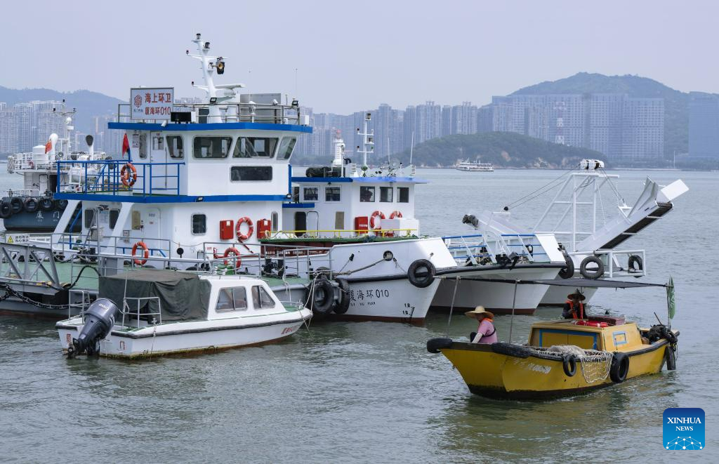 Staff members monitor stray waste in the waters of Xiamen at a sanitation dock in Xiamen, southeast China's Fujian Province, June 4, 2023.?(Xinhua/Wei Peiquan)