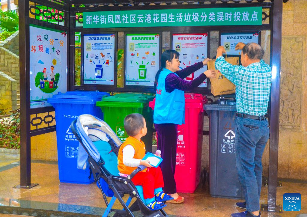 This undated photo shows a volunteer helping a man with garbage classification at a residential community in Guangzhou, south China's Guangdong Province. TO GO WITH (Guangzhou urban management bureau/Handout via Xinhua)