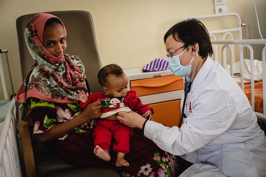 Doctor Zhang Chunyan (right) diagnoses a child at Orotta Hospital in Asmara, Eritrea, on May 9, 2023. Doctors of the 16th Chinese medical team to Eritrea have conducted 346 surgeries and 2,120 medical imaging examinations since they arrived in the East African country on April 17, 2023. Nearly 300 Chinese doctors have provided medical services in Eritrea since 1997. (Xinhua/Wang Guansen)