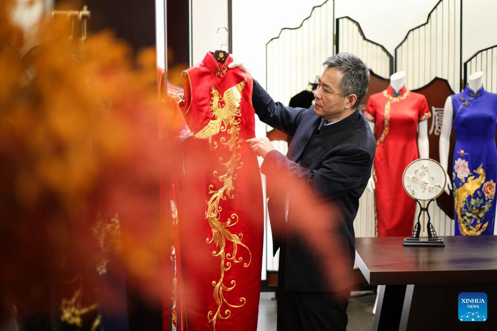 Cheongsams with dragon and phoenix patterns are seen at the Longfeng Cheongsam store in Shanghai, east China, May 30, 2023. (Xinhua/Liu Ying)