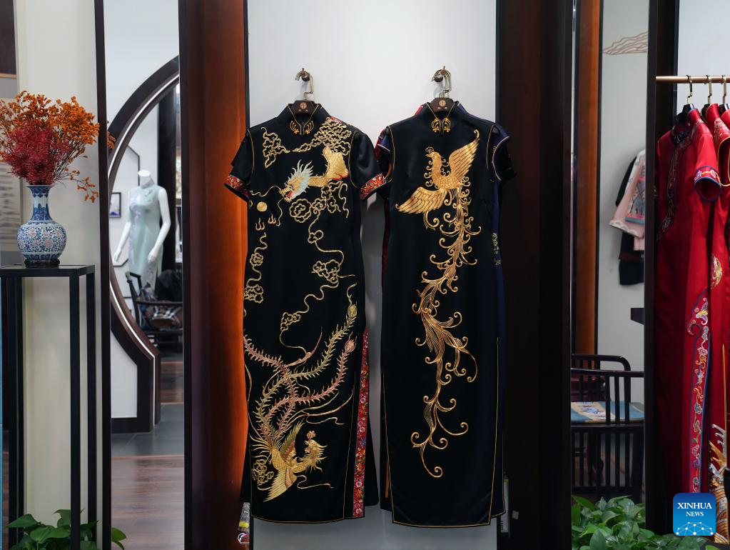 Cheongsams with dragon and phoenix patterns are seen at the Longfeng Cheongsam store in Shanghai, east China, May 30, 2023. (Xinhua/Xin Mengchen)