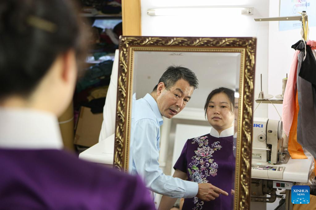 Jiang Manzong helps a customer to try on a cheongsam sample at a training institute for Longfeng Cheongsam in Shanghai, east China, May 31, 2023. (Xinhua/Xin Mengchen)