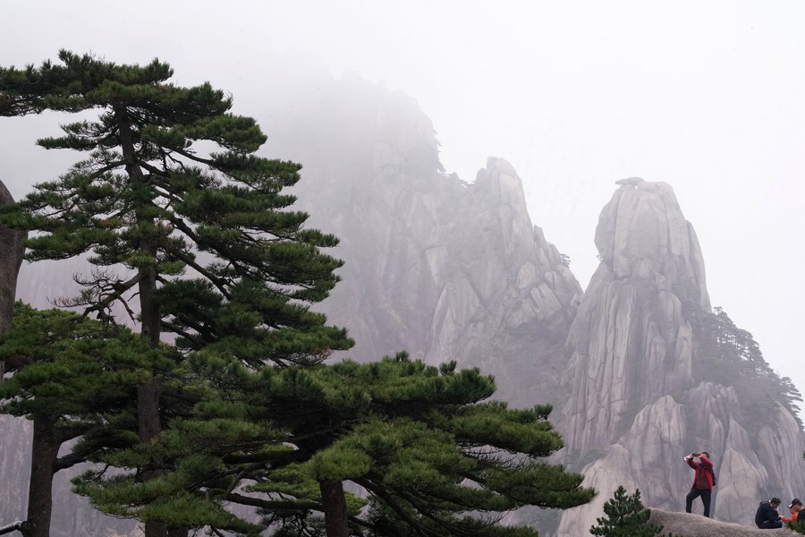 A tourist takes photos of pine trees on Huangshan Mountain in east China's Anhui Province, April 11, 2023. (Xinhua/Ma Ning)
