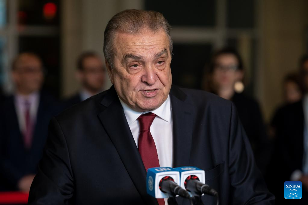 Amar Bendjama, Algeria's permanent representative to the United Nations, speaks to reporters after his country was elected as a non-permanent member of the UN Security Council at the UN headquarters in New York, on June 6, 2023. Algeria, Guyana, the Republic of Korea, Sierra Leone, and Slovenia were elected non-permanent members of the UN Security Council on Tuesday for a two-year term. The newly elected members will take up their new responsibilities on Jan. 1, 2024, and serve till Dec. 31, 2025. (Loey Felipe/UN Photo/Handout via Xinhua)