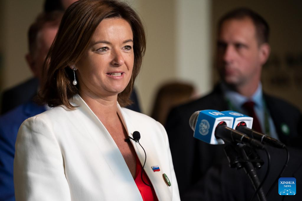 Slovenian Foreign Minister Tanja Fajon speaks to reporters after her country was elected as a non-permanent member of the UN Security Council at the UN headquarters in New York, on June 6, 2023. Algeria, Guyana, the Republic of Korea, Sierra Leone, and Slovenia were elected non-permanent members of the UN Security Council on Tuesday for a two-year term. The newly elected members will take up their new responsibilities on Jan. 1, 2024, and serve till Dec. 31, 2025. (Loey Felipe/UN Photo/Handout via Xinhua)