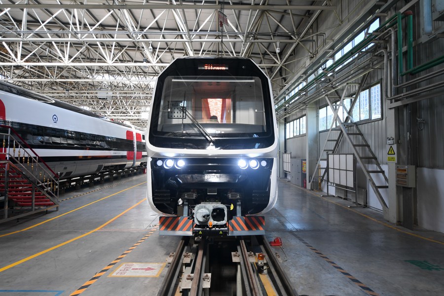 This photo taken on June 6, 2023 shows the first new-energy light rail train made by CRRC Tangshan Co., Ltd. for Argentina in Tangshan, north China's Hebei Province.(Xinhua/Gao Bo)