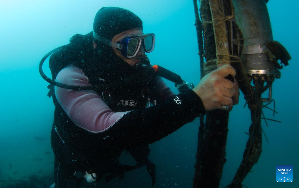 Wang Fengguo works underwater at a marine ranch in the sea area of Wuzhizhou Island in Sanya, south China's Hainan Province, Jan. 12, 2020. (Xinhua/Yang Guanyu)