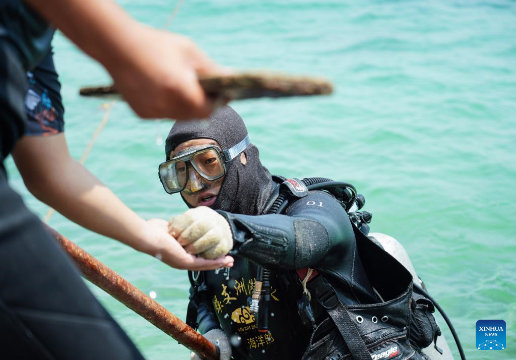 Wang Fengguo gets out of the water after coral transplantation at a marine ranch in the sea area of Wuzhizhou Island in Sanya, south China's Hainan Province, May 17, 2023. (Xinhua/Fan Yuqing)