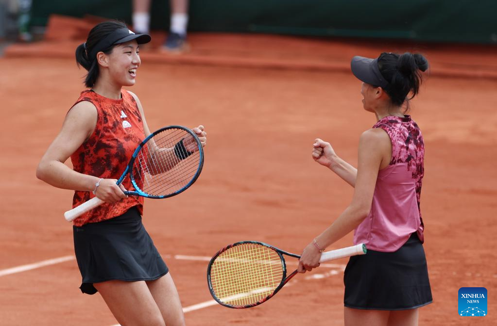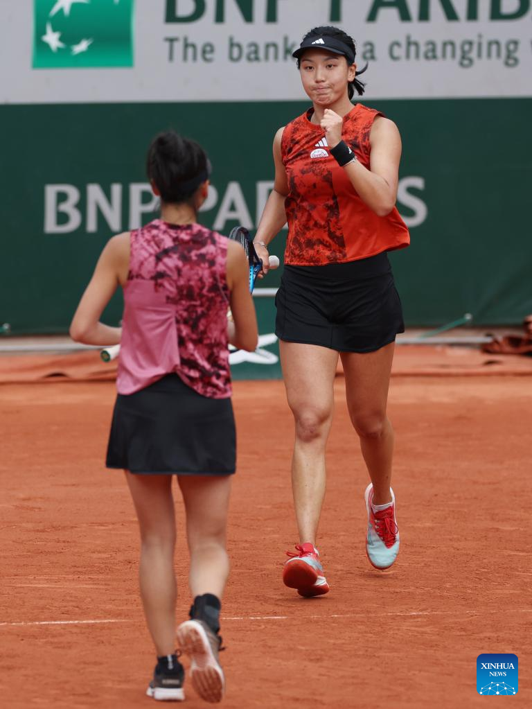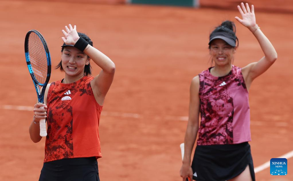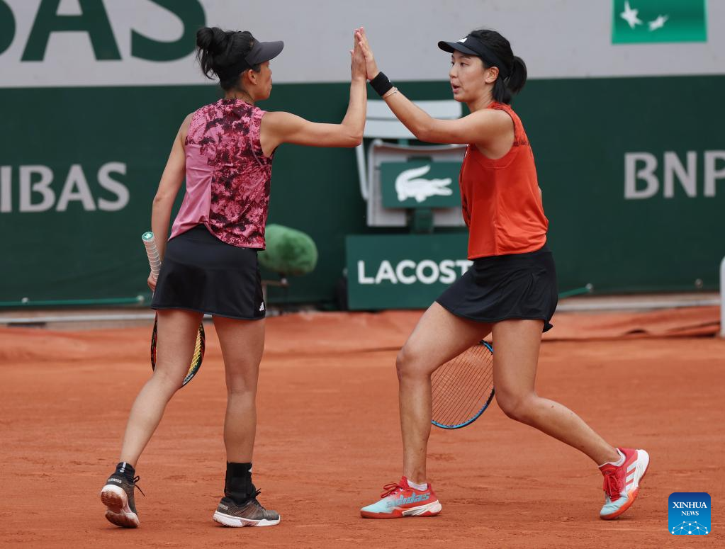 Wang Xinyu (L) of China/Hsieh Su-Wei of Chinese Taipei celebrate during the women's doubles quarterfinals between Wang Xinyu of China/Hsieh Su-Wei of Chinese Taipei and Veronika Kudermetova/Liudmila Samsonova of Russia at the French Open tennis tournament at Roland Garros in Paris, France, June 7, 2023. (Xinhua/Gao Jing)
