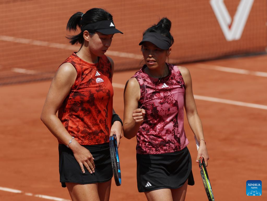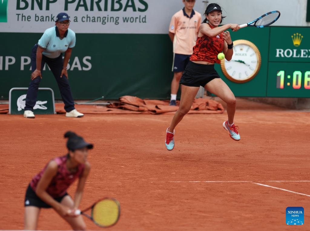 Wang Xinyu (R) of China/Hsieh Su-Wei of Chinese Taipei compete during the women's doubles quarterfinals between Wang Xinyu of China/Hsieh Su-Wei of Chinese Taipei and Veronika Kudermetova/Liudmila Samsonova of Russia at the French Open tennis tournament at Roland Garros in Paris, France, June 7, 2023. (Xinhua/Gao Jing)
