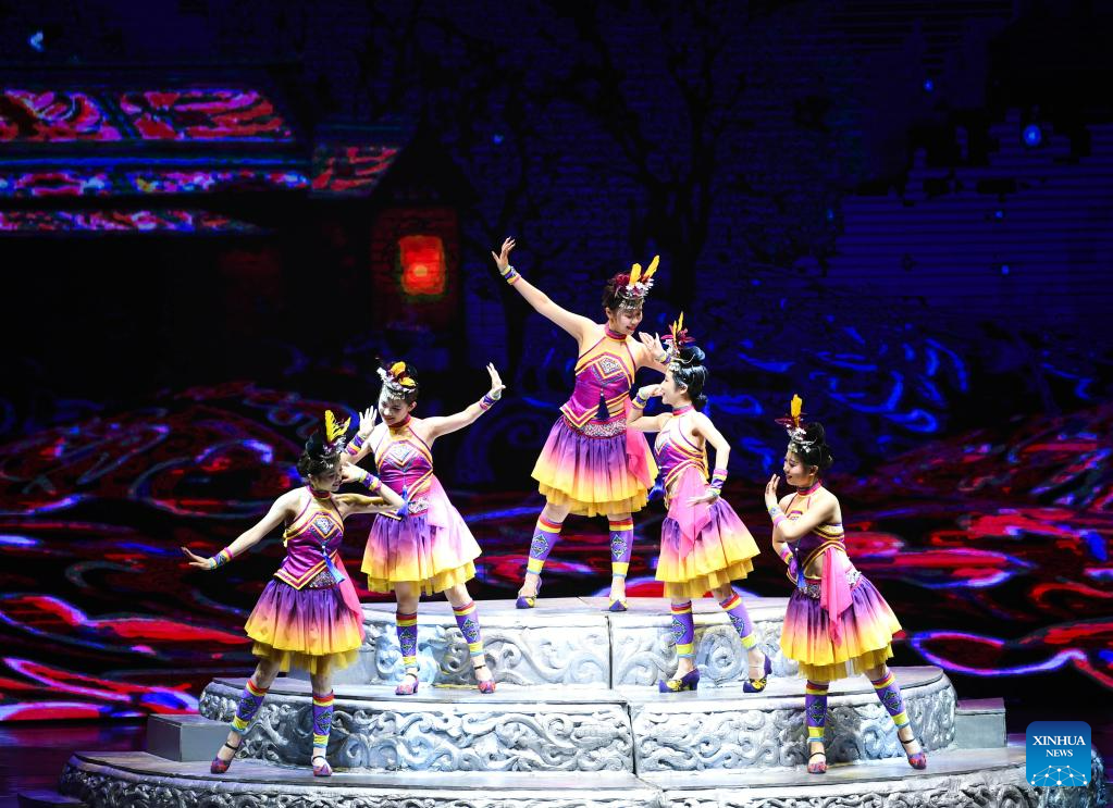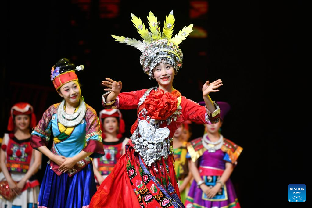 Actors perform in the show "Colorful Guizhou Style" at Guiyang Grand Theatre in Guiyang, southwest China's Guizhou Province, June 5, 2023. The "Colorful Guizhou Style" show, which debuted in 2006, has been performed in over 40 countries or regions worldwide and seen by over 10 million people. The show illustrates the vibrant ethnic culture of Guizhou and the hospitable people living there. (Xinhua/Yang Wenbin)