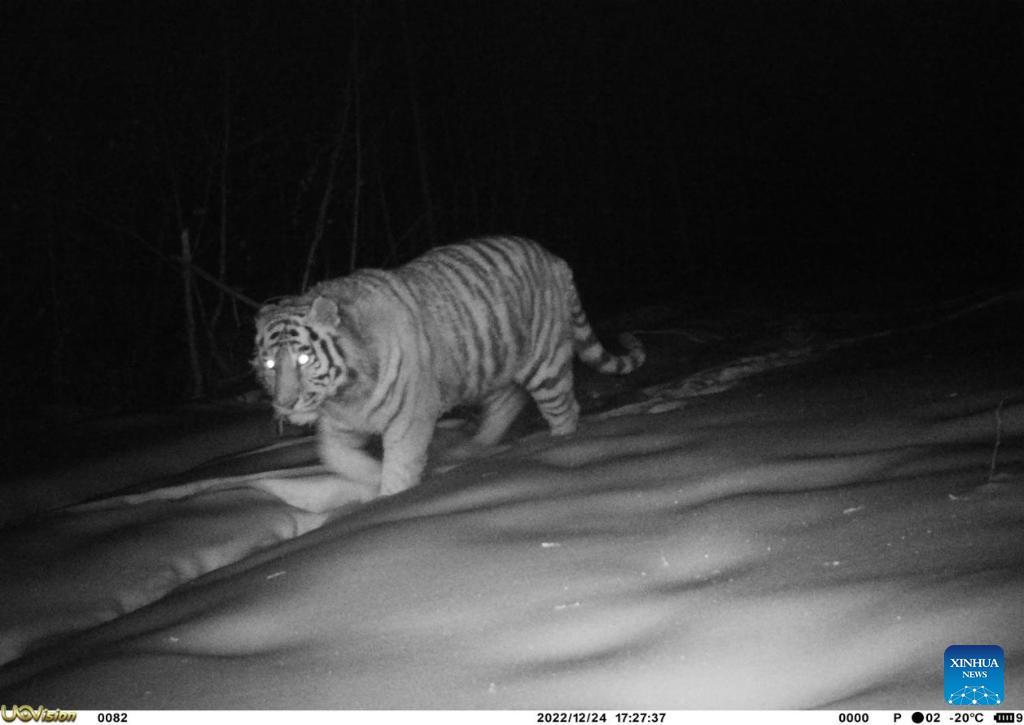 This photo taken by an infrared camera on Dec. 24, 2022 shows a wild Siberian tiger in the Greater Hinggan Mountains in northeast China's Heilongjiang Province.