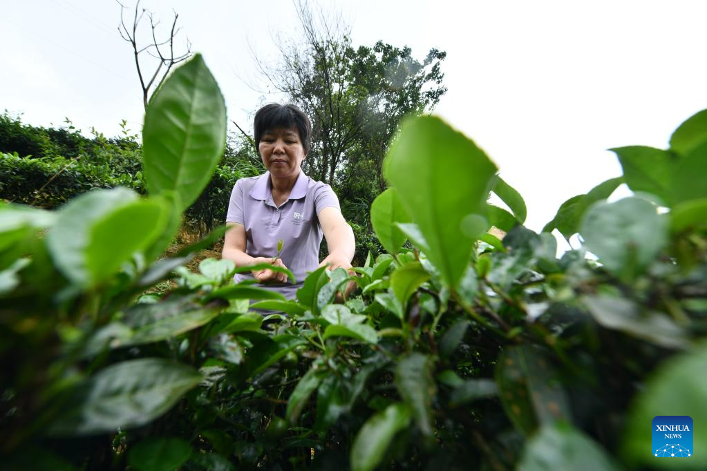 Zhu Xuelan harvests tea at Shanping Village of Cangwu County, south China's Guangxi Zhuang Autonomous Region, June 7, 2023. Zhu Xuelan, Party secretary of Shangping Village and representative inheritor of Liubao tea making technique, has promoted traditional tea making technique and developed the tea planting industry to increase local residents' incomes. (Xinhua/Huang Xiaobang)
