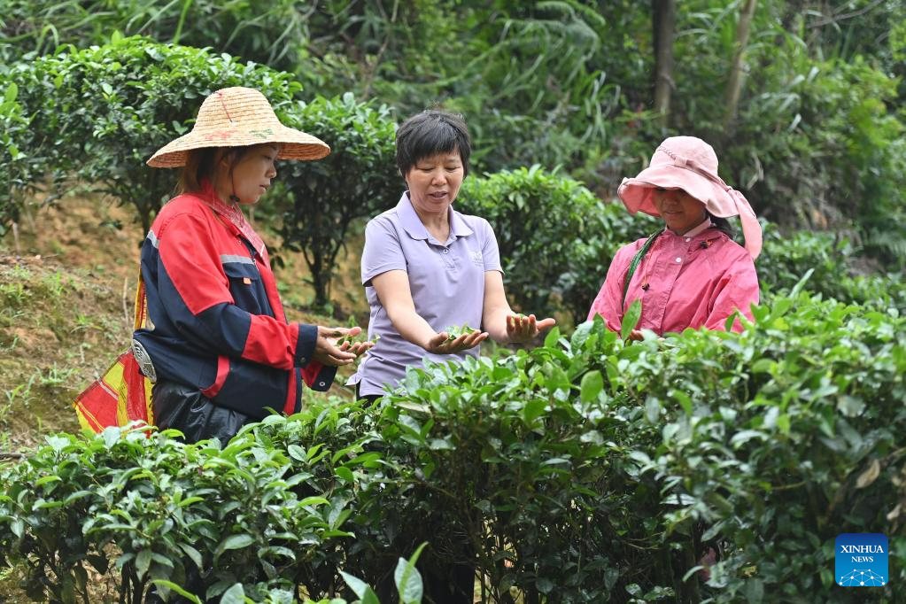 Zhu Xuelan (C) and villagers harvest tea at Shanping Village of Cangwu County, south China's Guangxi Zhuang Autonomous Region, June 7, 2023. Zhu Xuelan, Party secretary of Shangping Village and representative inheritor of Liubao tea making technique, has promoted traditional tea making technique and developed the tea planting industry to increase local residents' incomes. (Xinhua/Huang Xiaobang)