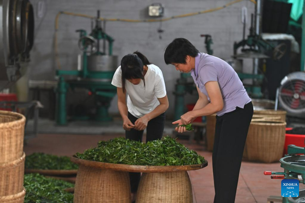 Zhu Xuelan (R) is engaged in tea processing at Shanping Village of Cangwu County, south China's Guangxi Zhuang Autonomous Region, June 7, 2023. Zhu Xuelan, Party secretary of Shangping Village and representative inheritor of Liubao tea making technique, has promoted traditional tea making technique and developed the tea planting industry to increase local residents' incomes. (Xinhua/Huang Xiaobang)