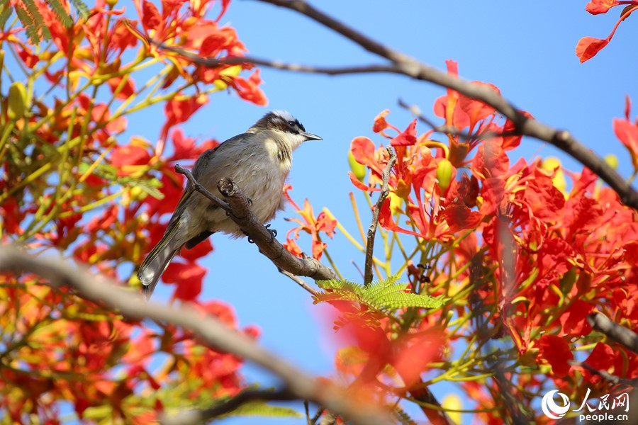 A light-vented bulbul preens itself on a branch of a flowering flame tree near Yundang Lake in Xiamen city, southeast China's Fujian Province. (People's Daily Online/Chen Bo)