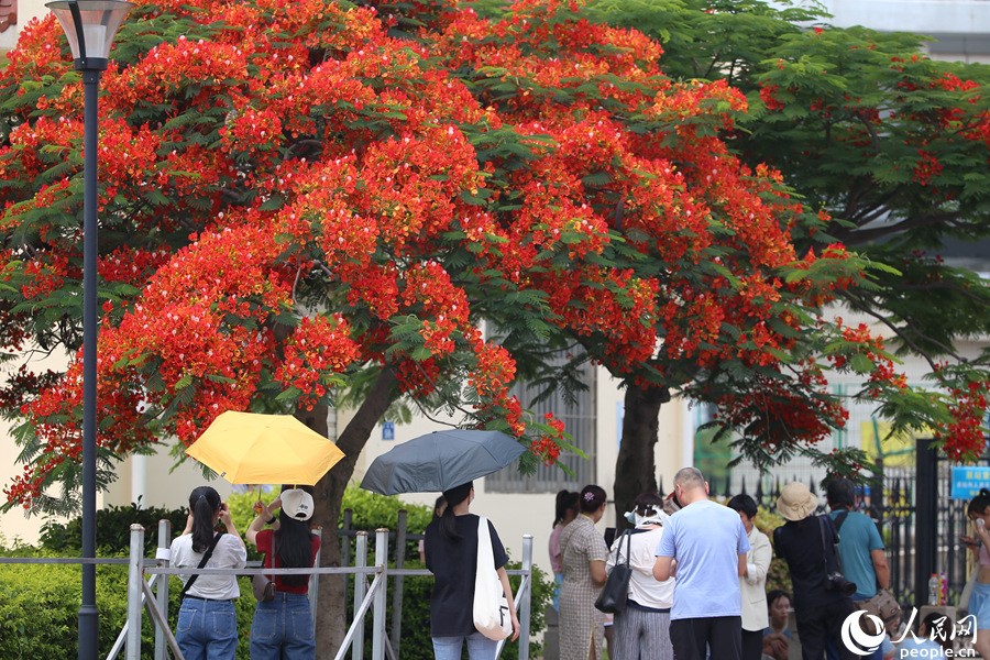 Citizens take pictures of flowering flame trees in Jimei district, Xiamen city, southeast China's Fujian Province.? (People's Daily Online/Chen Bo)