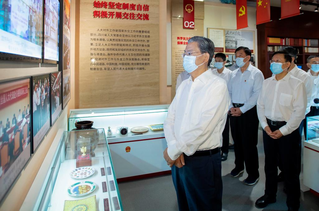 Zhao Leji, a member of the Standing Committee of the Political Bureau of the Communist Party of China Central Committee and chairman of the National People's Congress Standing Committee, visits a museum on the history of Sichuan Provincial People's Congress in Chengdu, southwest China's Sichuan Province, June 7, 2023. Zhao made a research tour in southwest China's Sichuan Province from Tuesday to Friday. Leading an inspection team, Zhao examined the enforcement of the Seed Law in several cities in Sichuan. (Xinhua/Li Tao)