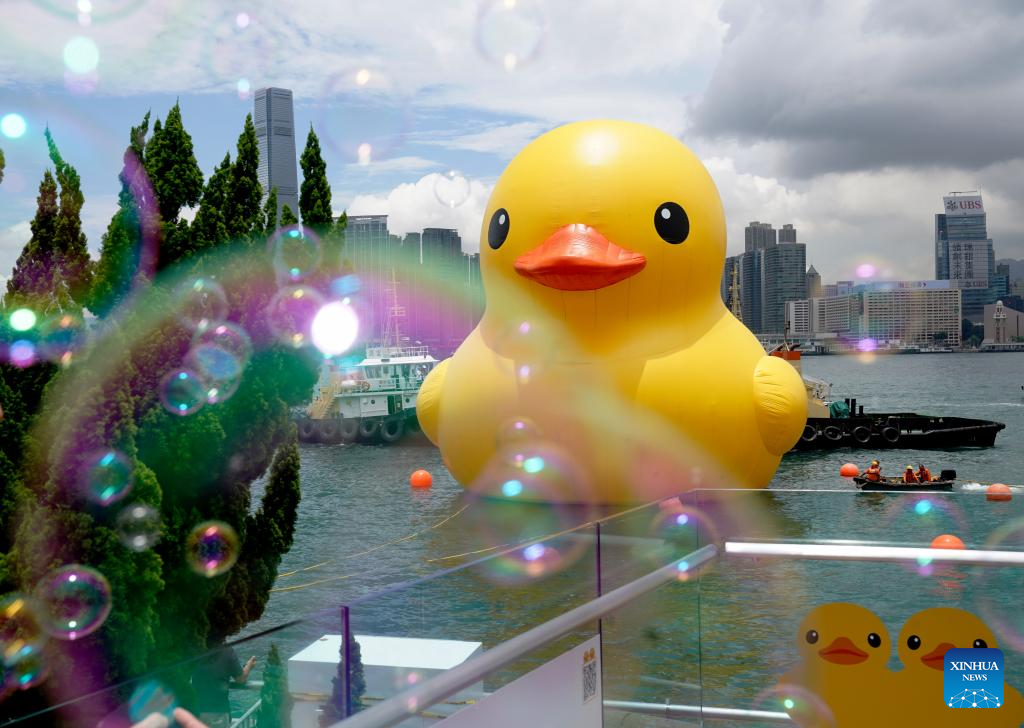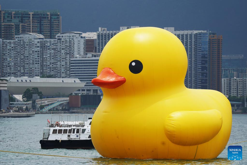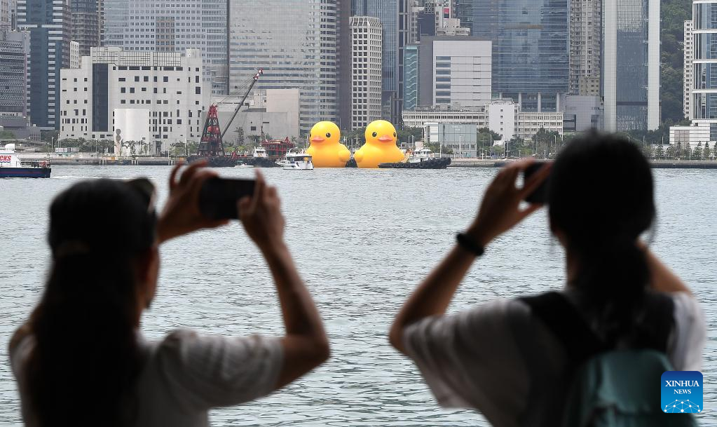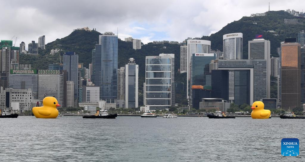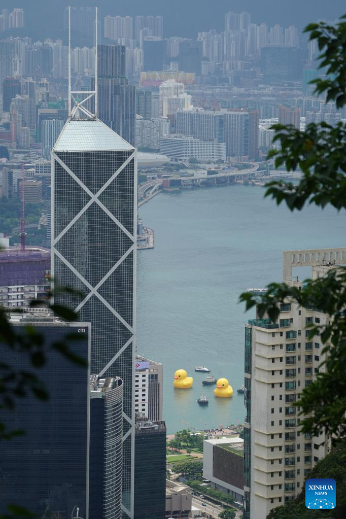 HONG KONG, June 9 (Xinhua) -- A pair of giant rubber ducks captured the attention of Hongkongers on Friday as they floated in Victoria Harbor as part of a public art exhibition that aims to bring more joy to the city.