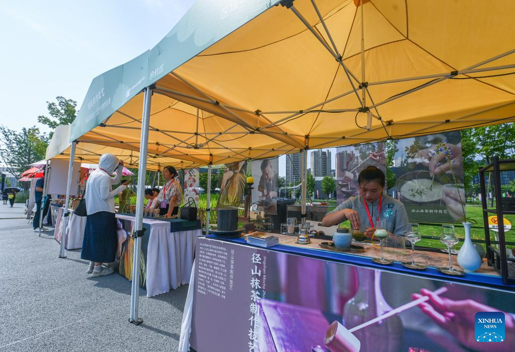Intangible cultural heritages and relevant products are exhibited during an activity marking the upcoming Cultural and Natural Heritage Day in Hangzhou, east China's Zhejiang Province, June 9, 2023. A series of activities in celebration of the upcoming Cultural and Natural Heritage Day were held at the Gongshu Canal Sports Park in Hangzhou, showcasing 66 Chinese intangible cultural heritages which are inscribed at UNESCO, national, provincial, municipal or district levels. (Xinhua/Xu Yu)