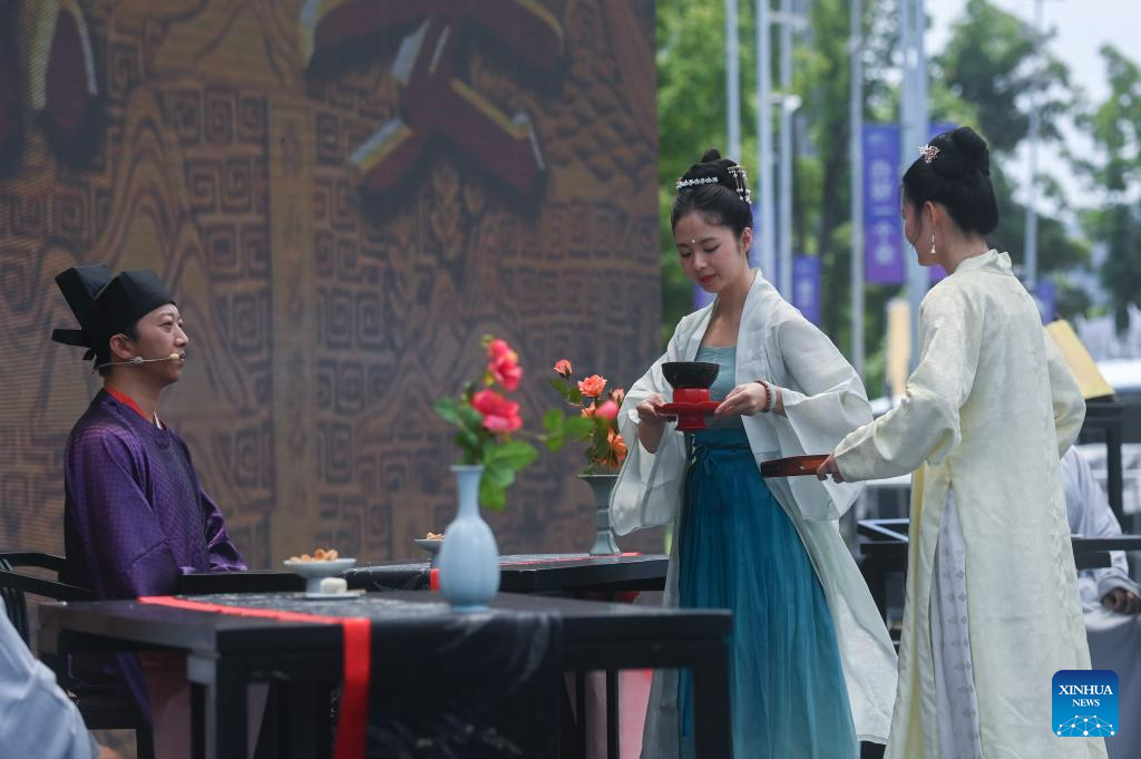 Actors perform the Jingshan tea ceremony, a national-level intangible cultural heritage, during an activity marking the upcoming Cultural and Natural Heritage Day in Hangzhou, east China's Zhejiang Province, June 9, 2023. A series of activities in celebration of the upcoming Cultural and Natural Heritage Day were held at the Gongshu Canal Sports Park in Hangzhou, showcasing 66 Chinese intangible cultural heritages which are inscribed at UNESCO, national, provincial, municipal or district levels. (Xinhua/Xu Yu)