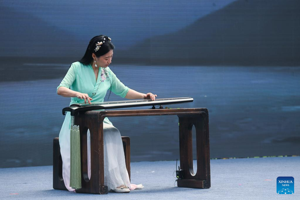 An actor stages a Zhejiang-style Guqin performance during an activity marking the upcoming Cultural and Natural Heritage Day in Hangzhou, east China's Zhejiang Province, June 9, 2023. A series of activities in celebration of the upcoming Cultural and Natural Heritage Day were held at the Gongshu Canal Sports Park in Hangzhou, showcasing 66 Chinese intangible cultural heritages which are inscribed at UNESCO, national, provincial, municipal or district levels. (Xinhua/Xu Yu)