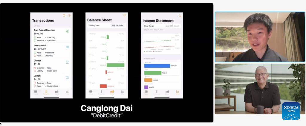 The screenshot shows Chinese student Dai Canglong (Top, R) sharing his thoughts on his project called "DebitCredit," a double-entry accounting app designed on the basis of "double-entry bookkeeping method, during a virtual meetup with Apple CEO Tim Cook. "I hope to make technology and services equally accessible to all by creating more meaningful apps," said Dai Canglong, a Chinese college student who won Apple's 2023 Worldwide Developers Conference (WWDC23) Swift Student Challenge. (Xinhua)