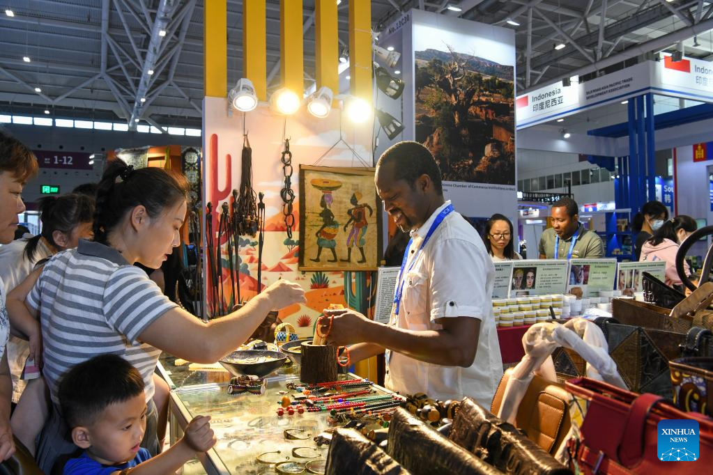 Visitors buy products at a booth from Mali during the 19th China (Shenzhen) International Cultural Industries Fair in Shenzhen, south China's Guangdong Province, June 9, 2023. The 19th China (Shenzhen) International Cultural Industries Fair kicked off here on Wednesday, which is expected to inject new impetus into the development of the country's cultural industry. Over 300 exhibitors from more than 50 countries and regions have registered to display their distinctive products in the fair's Belt and Road International Exhibition Area. (Xinhua/Liang Xu)