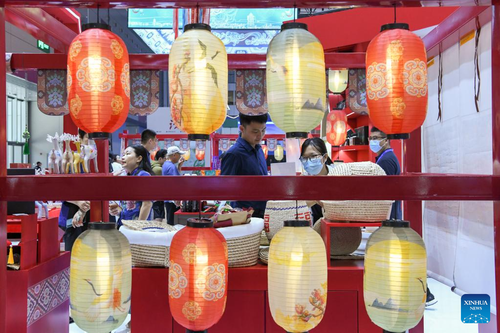 Visitors choose products at China's Shaanxi booth during the 19th China (Shenzhen) International Cultural Industries Fair in Shenzhen, south China's Guangdong Province, June 9, 2023. The 19th China (Shenzhen) International Cultural Industries Fair kicked off here on Wednesday, which is expected to inject new impetus into the development of the country's cultural industry. Over 300 exhibitors from more than 50 countries and regions have registered to display their distinctive products in the fair's Belt and Road International Exhibition Area. (Xinhua/Liang Xu)