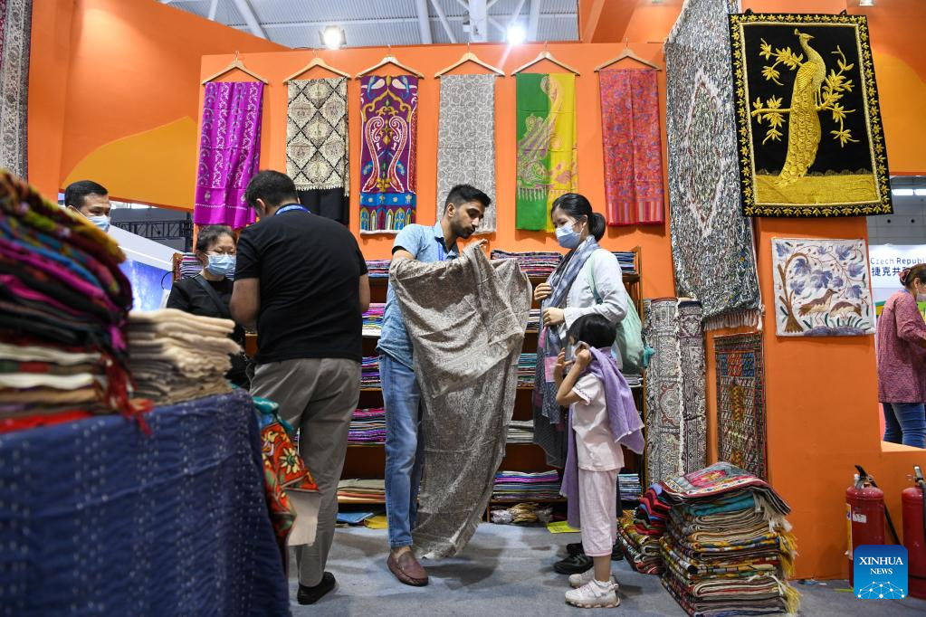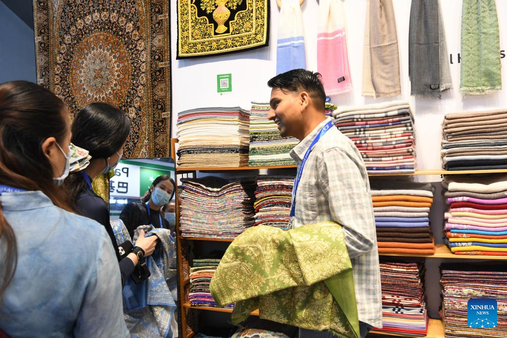 Visitors buy products at a booth from Nepal during the 19th China (Shenzhen) International Cultural Industries Fair in Shenzhen, south China's Guangdong Province, June 9, 2023. The 19th China (Shenzhen) International Cultural Industries Fair kicked off here on Wednesday, which is expected to inject new impetus into the development of the country's cultural industry. Over 300 exhibitors from more than 50 countries and regions have registered to display their distinctive products in the fair's Belt and Road International Exhibition Area. (Xinhua/Liang Xu)