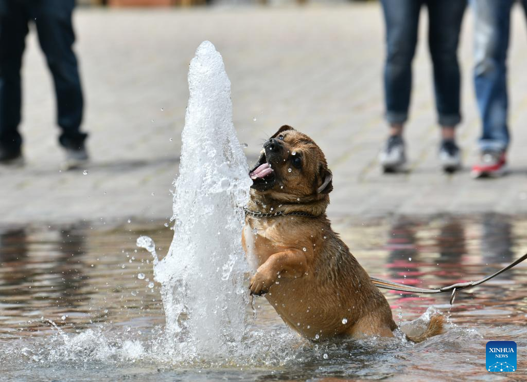 A dog plays in downtown Stralsund, northeastern Germany, June 1, 2023. (Xinhua/Ren Pengfei)