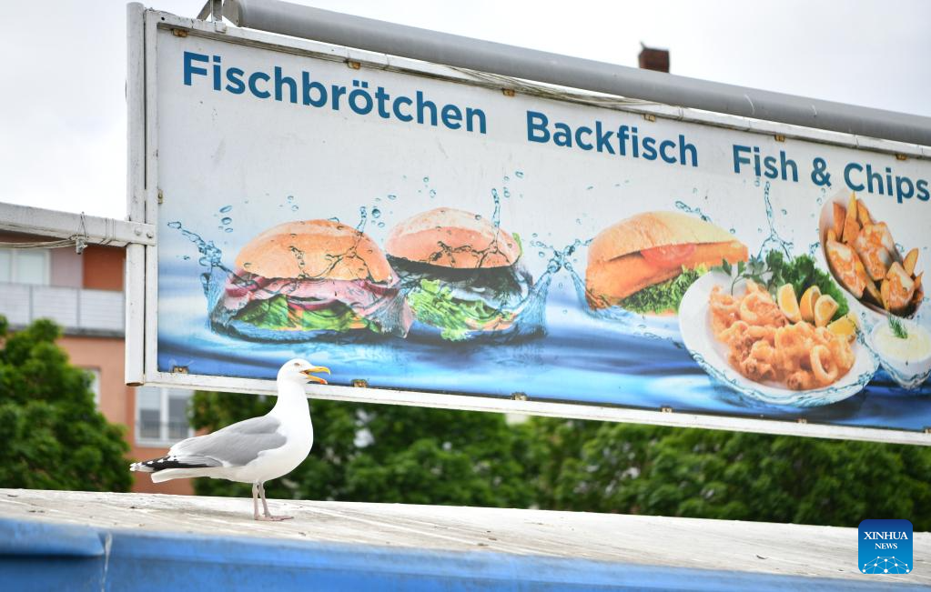 A sea gull rests on the roof of a fast food restaurant in Stralsund, northeastern Germany, June 1, 2023. (Xinhua/Ren Pengfei)
