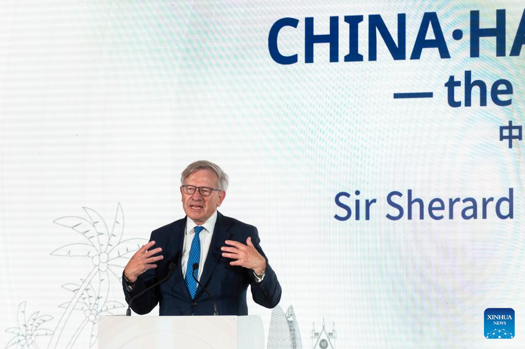 Sir Sherard Cowper-Coles, chair of the China-Britain Business Council, delivers a speech at China Hainan Free Trade Port -- the U.K. Promotion Conference in London, Britain, June 9, 2023. (Photo by Stephen Chung/Xinhua)