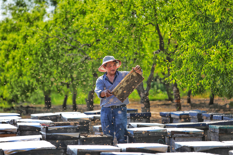 A beekeeper checks a beehive at a jujube orchard in Zhuji township, Laoling, east China's Shandong Province. (Photo/Jia Peng)