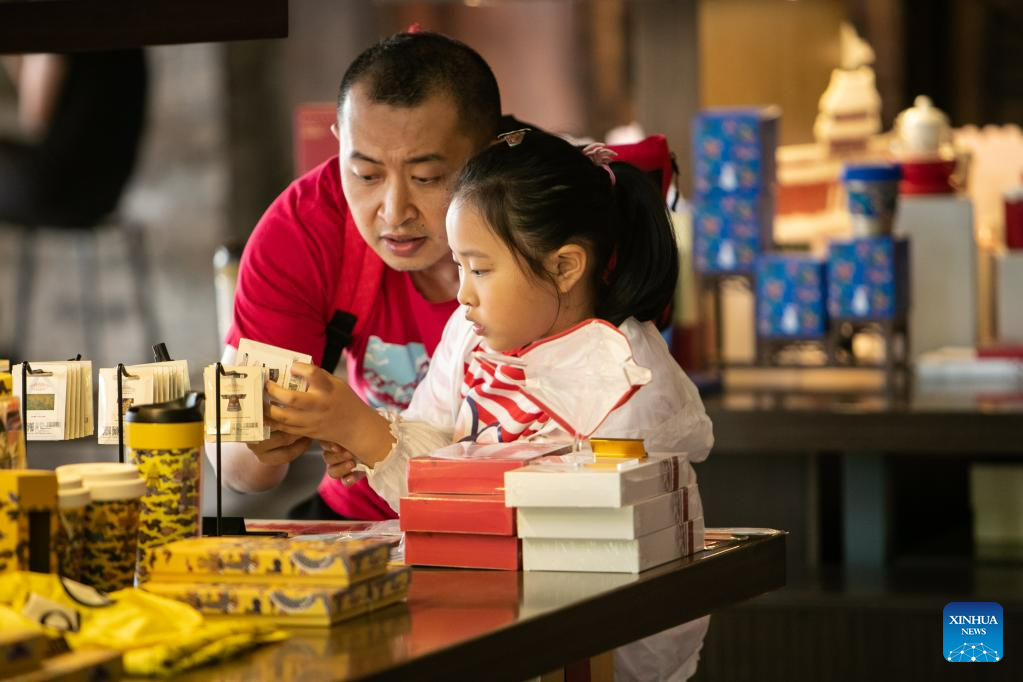 Tourist select souvenir at a cafe of a museum displaying the history of Palace Museum antiques moved there during World War II in southwest China's Chongqing, June 10, 2023. The museum is located in a former foreign firm, where nearly 4,000 cases of antiques were stored during wartime.