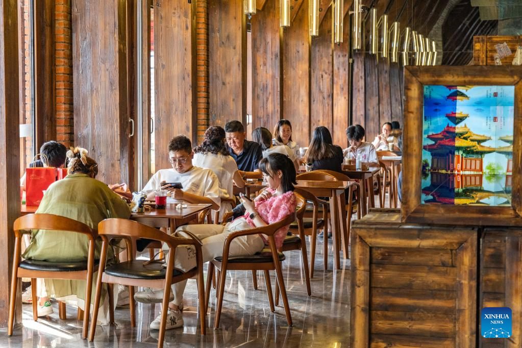 Tourists select souvenir at a cafe of a museum displaying the history of Palace Museum antiques moved there during World War II in southwest China's Chongqing, June 10, 2023. The museum is located in a former foreign firm, where nearly 4,000 cases of antiques were stored during wartime.