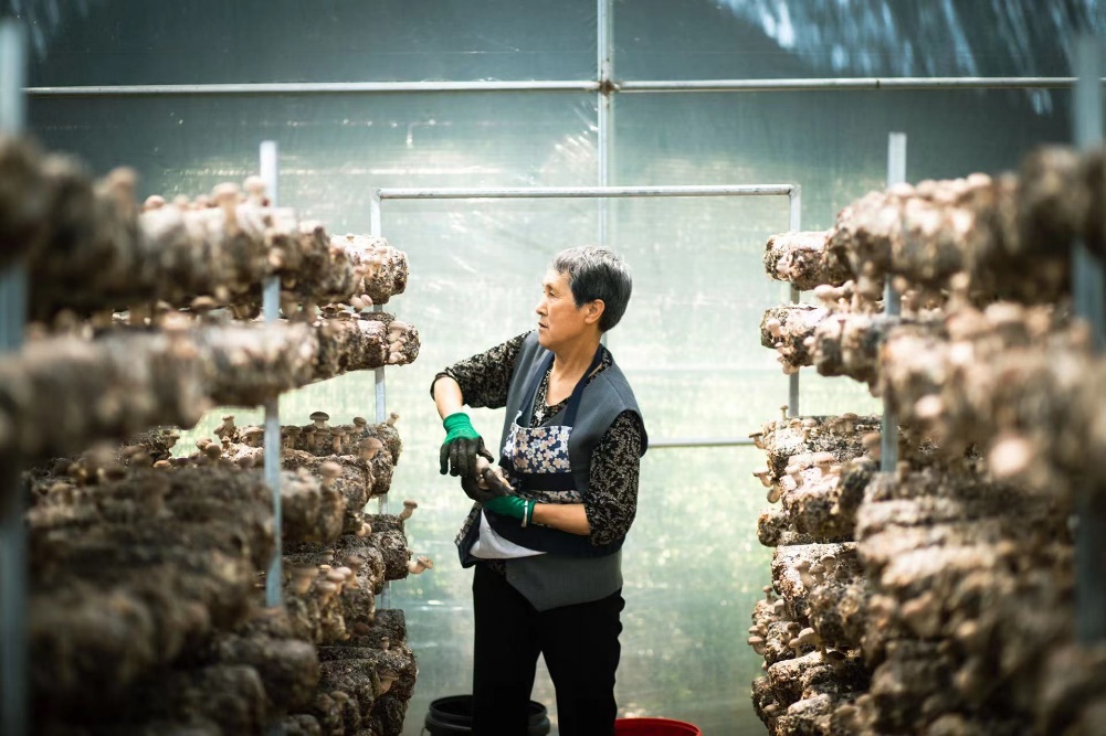 Liu Xiaoping, a local villager, picks mushrooms at a plantation in Liulin village, Miaowan township, Tongchuan city, northwest China's Shaanxi Province. (Photo courtesy of the interviewee)