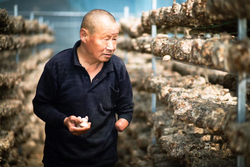 Despite losing his left hand in an accident, 63-year-old local Liu Xiaoping, maintains a positive attitude toward life. A few years ago, Liu became a mushroom dealer. In 2022, he secured the rights to operate 10 greenhouses for mushroom cultivation, hiring two men and 10 women to assist with his business.