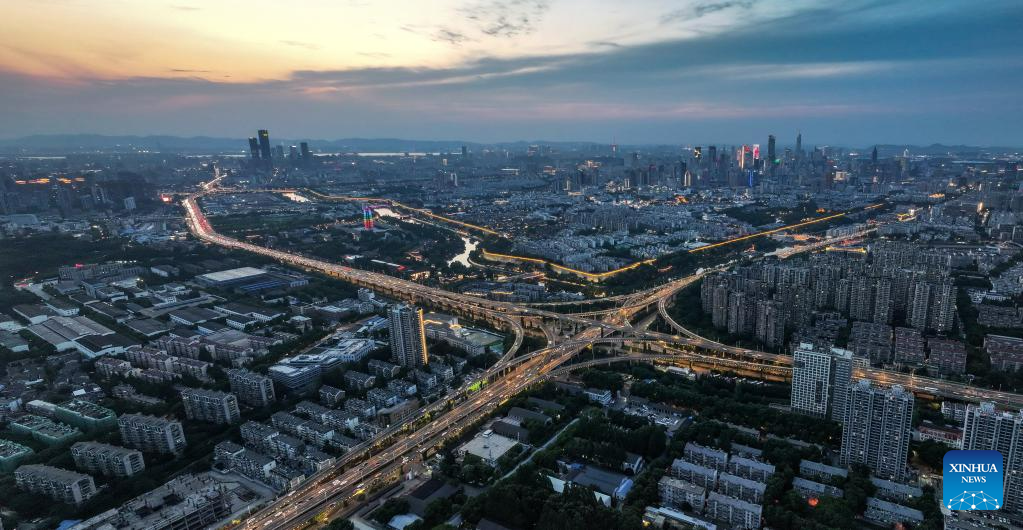 This aerial photo taken on June 11, 2023 shows a view of the Shuangqiaomen interchange junction in Nanjing, east China's Jiangsu Province. Nanjing, the capital of six dynasties in ancient China, has rich cultural accumulation and unique cultural landscapes. (Xinhua/Yang Lei)