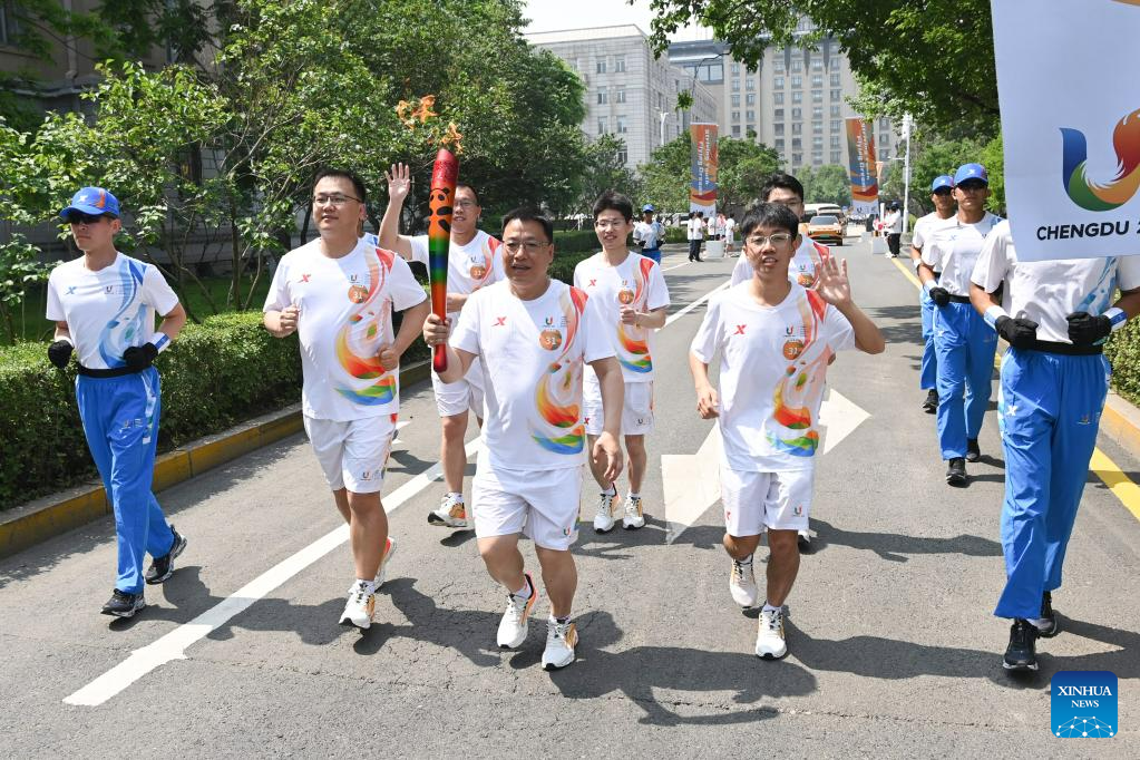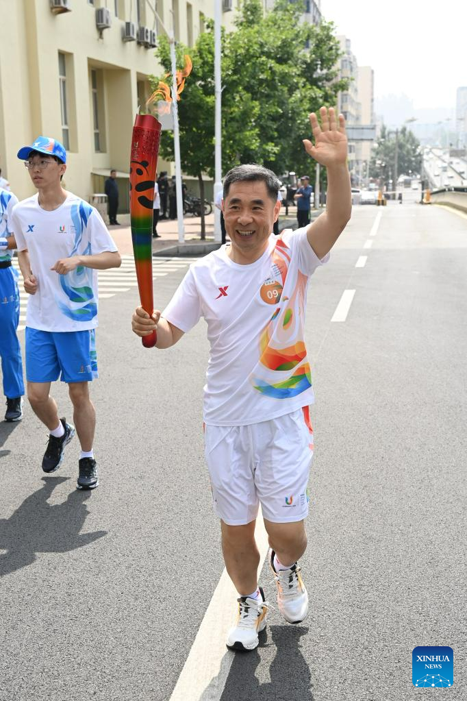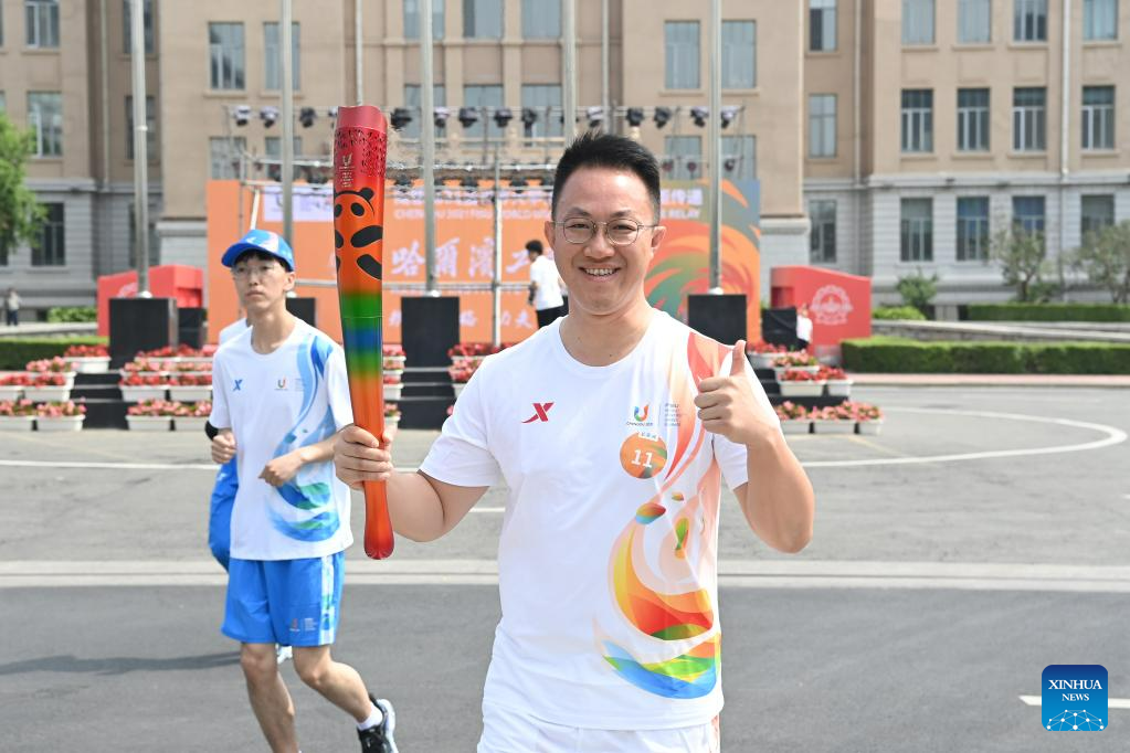 Torch bearer Ma Jun runs with the torch during the torch relay of the Chengdu 2021 FISU Summer World University Games at Harbin Institute of Technology in Harbin, northeast China's Heilongjiang Province, June 15, 2023. (Xinhua/Xie Jianfei)