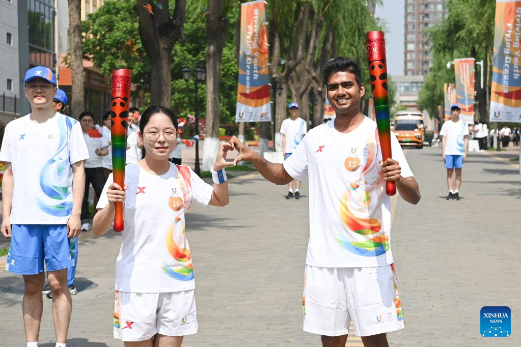 Torch bearers Yuan Mingkun (R) and Tu Lala pose during the torch relay of the Chengdu 2021 FISU Summer World University Games at Harbin Institute of Technology in Harbin, northeast China's Heilongjiang Province, June 15, 2023. (Xinhua/Xie Jianfei)
