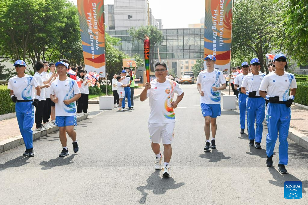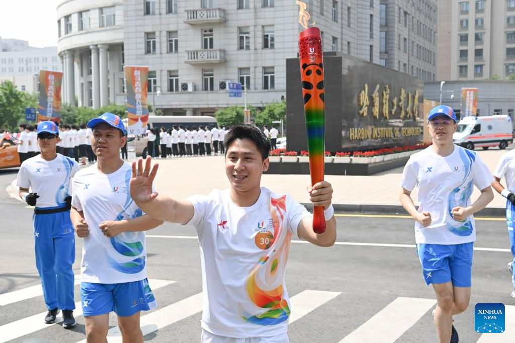 Torch bearer Yuan Mingkun runs with the torch during the torch relay of the Chengdu 2021 FISU Summer World University Games at Harbin Institute of Technology in Harbin, northeast China's Heilongjiang Province, June 15, 2023. (Xinhua/Xie Jianfei)