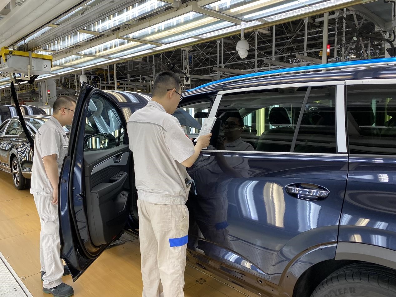Photo taken on June 14, 2023 shows workers checking on cars following their assembly at the factory of FAW-Volkswagen Automotive Co., Ltd. in Changchun, northeast China’s Jilin Province. (Photo/People’s Daily Online)