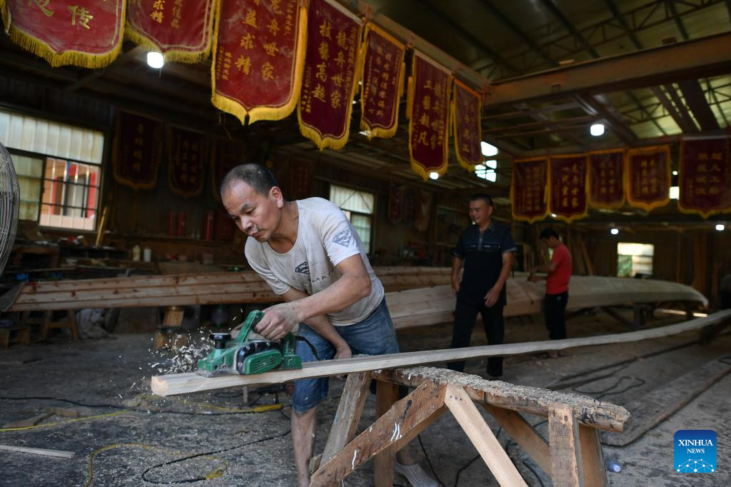 A craftsman makes dragon boats in Fangzhuang Village, Minhou County, Fuzhou City, southeast China's Fujian Province, June 12, 2023.