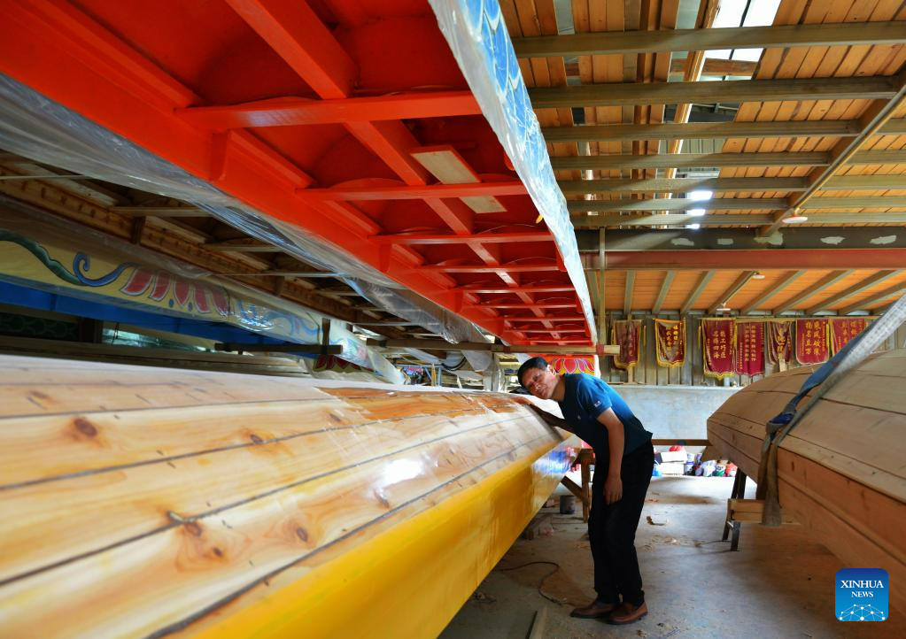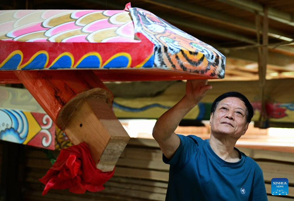 Fang Shaohuang, a local intangible cultural heritage inheritor, checks a traditional dragon boat in Fangzhuang Village, Minhou County, Fuzhou City, southeast China's Fujian Province, May 23, 2023.