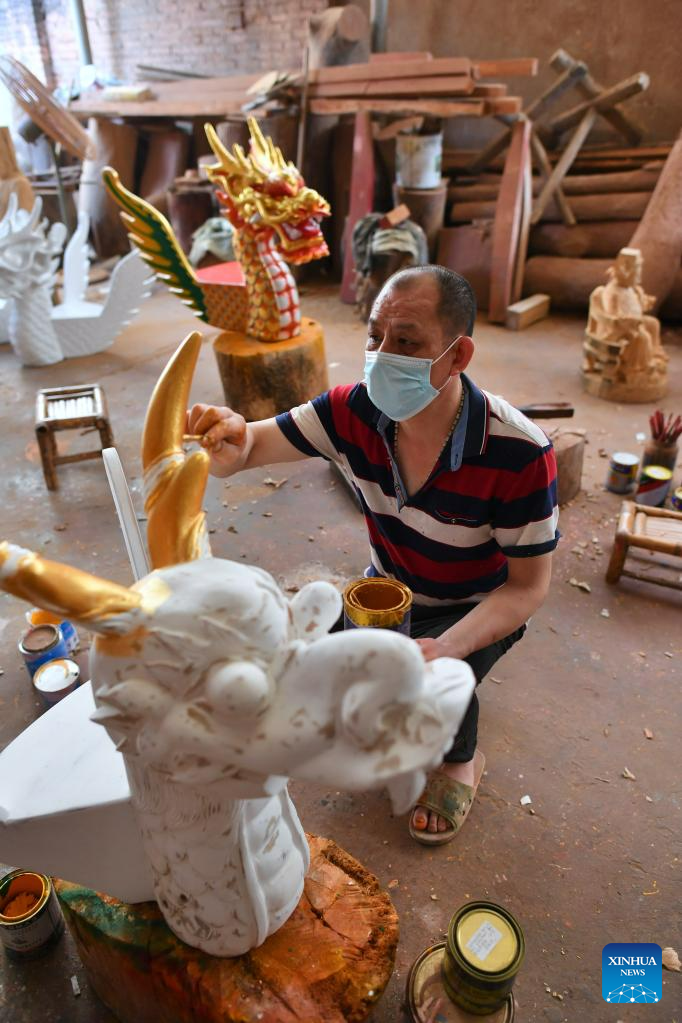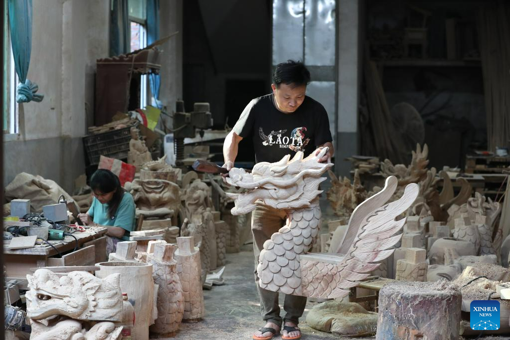 A craftsman carries a newly-carved dragon boat head in Fangzhuang Village, Minhou County, Fuzhou City, southeast China's Fujian Province, June 12, 2023.