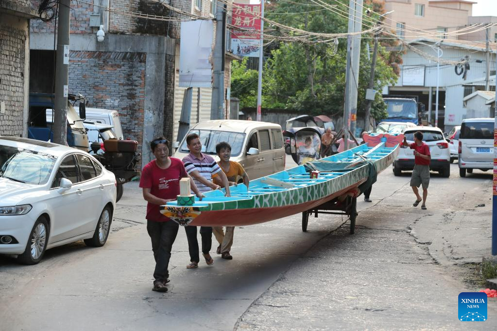 Villagers transport a dragon boat in Fangzhuang Village, Minhou County, Fuzhou City, southeast China's Fujian Province, June 12, 2023.