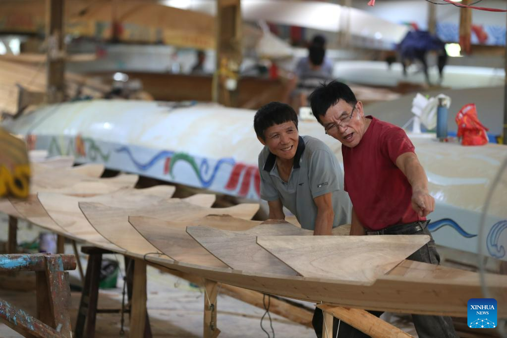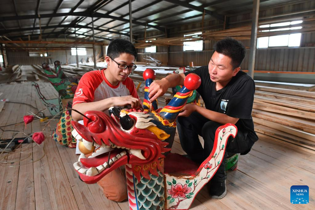 Craftsmen make a dragon boat in Fangzhuang Village, Minhou County, Fuzhou City, southeast China's Fujian Province, May 23, 2023.